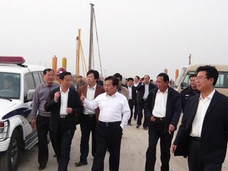 2008年4月14日,濰坊市委書記張新起視察集團公司施工中的奧體中心工程。集團公司總經理朱九洲(左上圖左三)陪同張書記視察 |