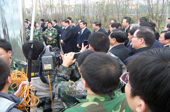 4月10日上午,山東省黨政代表團在省委書記姜異康、省長姜大明率領下,到北川新縣城檢查指導援建工作,山東省十七地市黨政負責人參加檢查。徐鵬強董事長在集團公司援建的安昌河堤頂道路上迎接檢查團并陪同檢查。