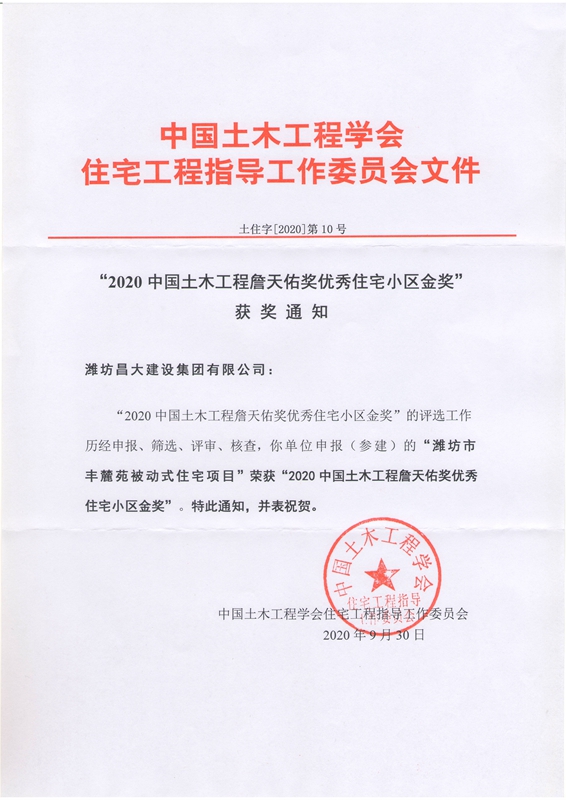 2020年10月12日上午,集團收悉中國土木工程學會文件“2020中國土木工程詹天佑獎優(yōu)秀住宅小區(qū)金獎獲獎通知”:歷經(jīng)申報、篩選、評審、核查,集團申報的由集團二建公司總承包施工、二安公司參與施工的濰坊市豐麓苑被動式住宅項目榮獲“2020中國土木工程詹天佑獎優(yōu)秀住宅小區(qū)金獎”。 據(jù)悉,這是濰坊歷史上首次獲得這一獎項。恭喜集團,恭喜集團全體員工,并向濰坊全體建筑業(yè)者分享這一榮譽。 附: 申報時間:2020年4月30日; 公示時間:2020年9月23日至30日; 獲獎時間:2020年9月30日。 ![]() |