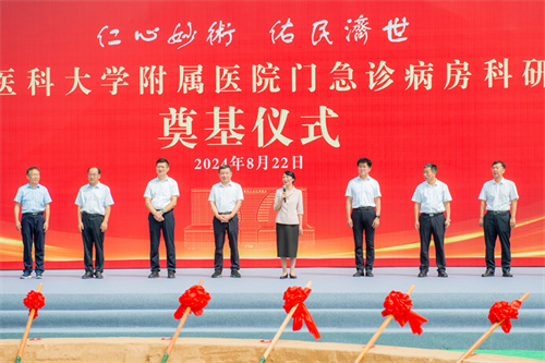 2024年8月22日上午,山東第二醫科大學附屬醫院門急診病房科研綜合樓項目舉行奠基儀式。濰坊市副市長、市政府黨組成員、奎文區委書記周俊出席儀式。出席儀式并在主席臺就位的領導和嘉賓還有:山東第二醫科大學黨委副書記、校長管英俊,濰坊市人民政府副秘書長張勇,市住建局黨組書記、局長、一級調研員馬冰,市衛生健康委員會黨組書記、主任、市中醫藥管理局局長張曉乙,奎文區人大常委會黨組書記、主任李光明,附屬醫院已退休原院長胡溫庭,濰坊天鵬建設監理有限公司董事長林少杰,奎文區委常委、辦公室主任、統戰部部長陳國璽,奎文區政府黨組成員、副區長周曉東,山東第二醫科大學黨委委員、副校長、附屬醫院黨委書記王承高,附屬醫院黨委副書記、院長鄧愛軍。奎文區大虞街道黨工委書記朱春雷出席奠基活動。集團公司董事長徐鵬強、總裁朱九洲出席儀式并在主席臺就位。集團參與項目的總承包單位、施工單位領導班子成員和員工代表參加儀式。